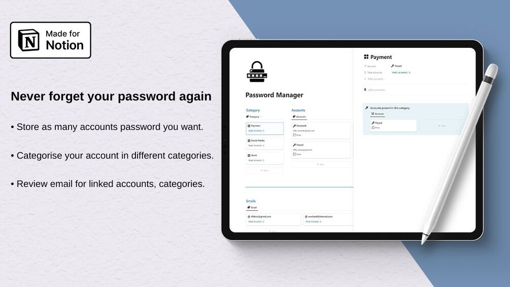With this notion password manager, you can Securely store passwords for various accounts and review emails for your linked accounts and categories.